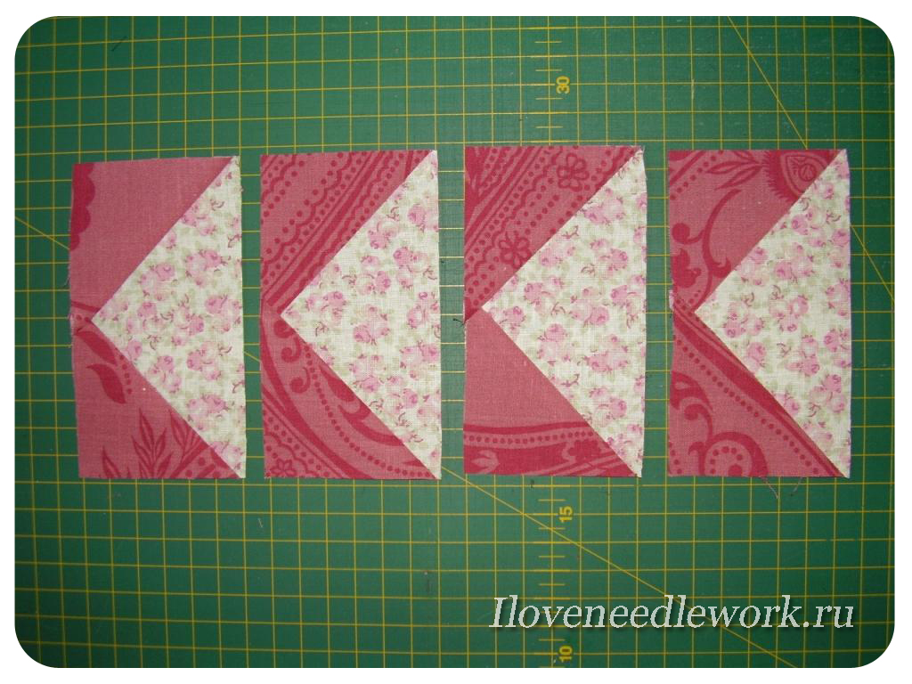 Отгибаем уголки, проглаживаем и в итоге из одного большого квадрата 5 и1/4 дюйма и четырех маленьких квадратов 2 и7/8 дюйма получается 4 блока для пэчворка " летящие гуси", каждый размером 4 и1/2 дюйма на 2 и1/2 дюйма